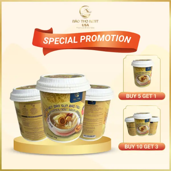 Bao Tho Nest USA’s Bird’s Nest Soup with Abalone Flavor is crafted from pure, fresh bird’s nests, expertly combined with the exquisite taste of abalone, delivering a soup that is not only highly nutritious but also a true delight for the palate. Produced in a fully enclosed manufacturing process, this product ensures absolute safety while preserving its original, authentic flavors.