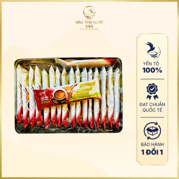 - Hòa chung với 85ml dung dịch nóng yêu thích (cà phê, sữa, chocolate,..) để cảm nhận vị ngon thơm trong từng sợi yến thiên nhiên