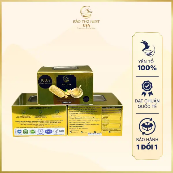- Sản phẩm đã có chứng chỉ ISO 22000:2018, đạt tiêu chuẩn GMP (TCVN 5603:2023) và được cấp giấy phép kinh doanh yến sào hợp pháp.