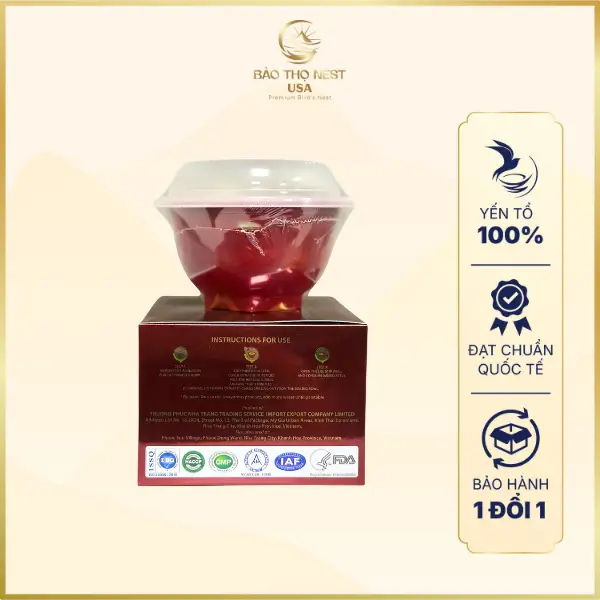 - Sản phẩm đã có chứng chỉ ISO 22000:2018, đạt tiêu chuẩn GMP (TCVN 5603:2023) và được cấp giấy phép kinh doanh yến sào hợp pháp.