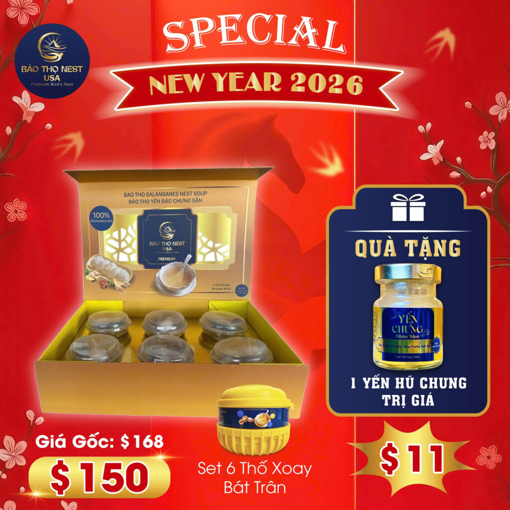 Tết ĐINH NGỌ 2026, ưu đãi 1 hộp Set 6 Thố Xoay Bát Trân $150, nhận ngay quà tặng 1 Yến Hũ $11.