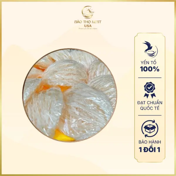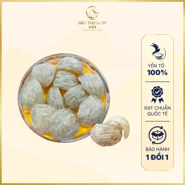 Yến Tổ Tinh Chế Sợi Dài Bảo Thọ Nest USA được làm sạch từ tổ yến thô nguyên chất. Những sợi yến trải qua bước tinh chế đắp tổ, sau đó sấy khô tự nhiên để giữ được nguyên vẹn hình dáng ban đầu. Tổ yến có đến 90% sợi dài đẹp mắt, cam kết không sử dụng chất tẩy trắng, chất phụ gia có hại sức khỏe.