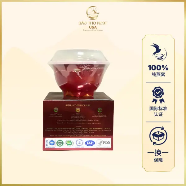 产品已通过 ISO 22000:2018 认证,符合 GMP 标准(TCVN 5603:2023),并获得合法的燕窝经营许可证。