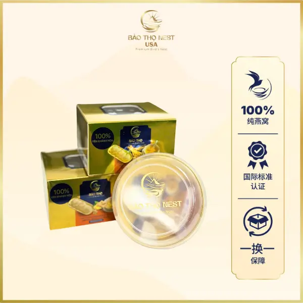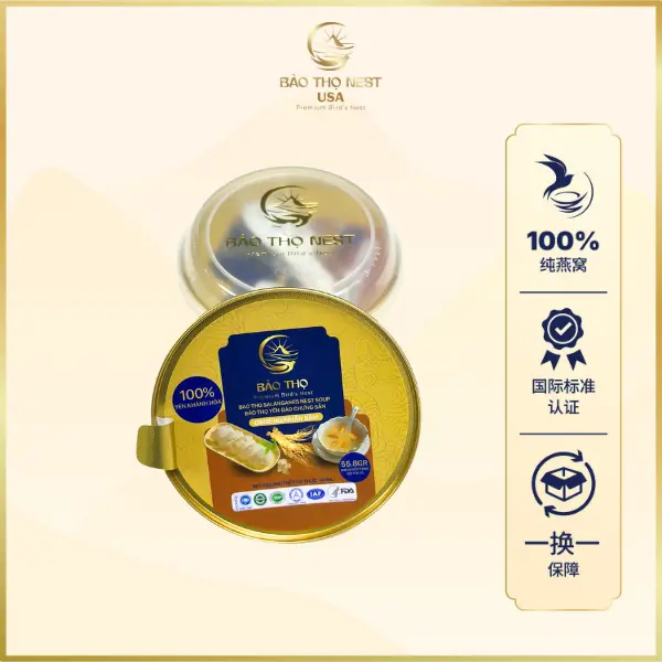 Bao tho Nest USA金盏即食燕窝·人参味的诞生,旨在成为守护消费者健康的顶级滋补佳品。在文化中,“金盏”象征尊贵与高雅,寓意产品在原料与工艺上的极致精选,只为将最好的呈现给顾客。Bao tho Nest USA的燕窝首先由庆和芽庄沿岛的大型燕屋严格筛选与检测。之后,产品以121°C的饱和蒸汽灭菌25分钟,最大程度保留营养并确保食品安全卫生。特别之处在于产品采用精巧小碗设计,外观精致便携,让您随时随地补充营养,保持健康活力。